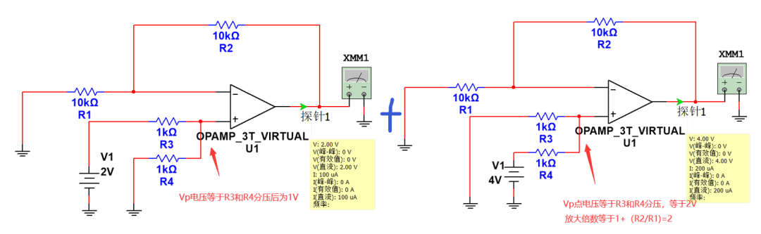 利用疊加定理,如左圖,先把2V的電源去掉,等效于接地,那么電路就等效為一個同相比例放大器,放大倍數(shù)等于 1+(R2/R1)=5倍,故左邊電路輸出電壓為0.2*5=1V。