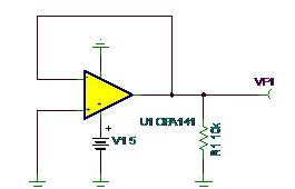 運算放大器的輸出也有限制,我們看一個簡單的設(shè)計。使用運算放大器OPA141設(shè)計跟隨電路,+5V供電,10K電阻R1為負載,同向輸入端接地,如下圖所示: