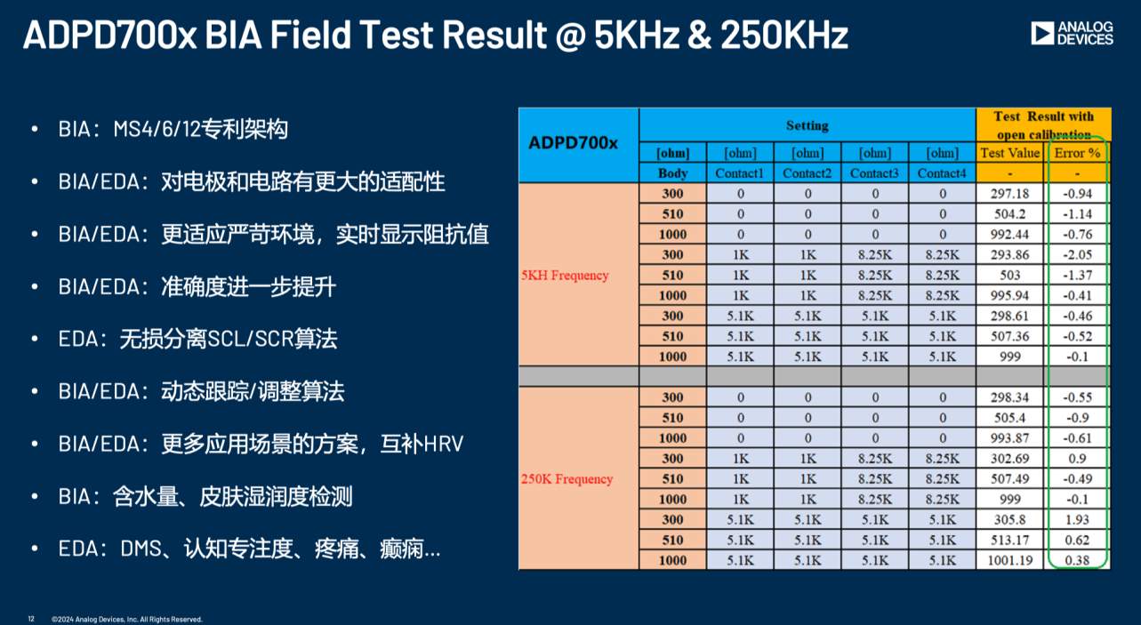 該技術原理聽起來比較簡單,但實際實現(xiàn)的難度極高。因為較慢的掃描頻率下的阻抗誤差很大,較快的掃描頻率下又會瘦到細胞膜導致的寄生電容印象。而ADI的MS4/6/12專利架構,可以將整體的誤差值下降到2%以內(nèi)。