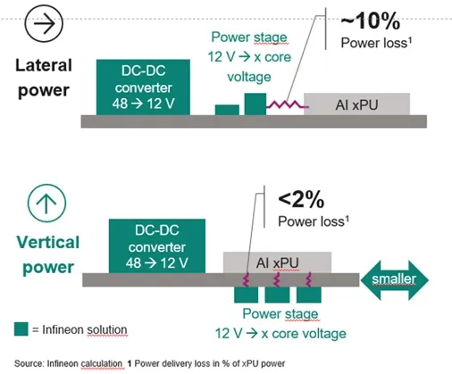 圖1:在12V向核心轉(zhuǎn)換過程中,垂直電力流實現(xiàn)了顯著的電力損失減少。