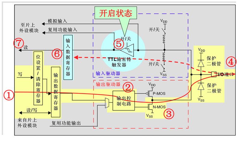 輸出 1 時(shí),N-MOS 高阻, P-MOS 不被激活,輸出1(需要外部上拉電路);可以讀IO輸入電平變化,此模式可以把端口作為雙向IO使用。