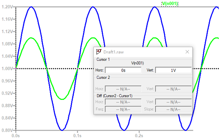 2、觀察第一級(jí)電路的單端輸入輸出波形,即V1與Vo1的波形,可以看出,輸入共模信號(hào)為1V,輸出共模信號(hào)仍為1V,共模增益為1,與理論分析相符。