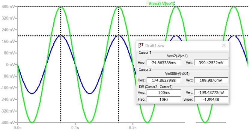 1、觀察第一級(jí)電路的輸入與輸出波形,即(V2-V1)與(Vo2-Vo1)的波形,可以看出,第一級(jí)電路的放大倍數(shù)近似為2,符合上述理論計(jì)算。
