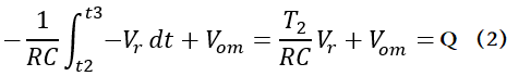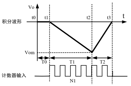 2、定時(shí)積分階段(t1-t2) :在此階段接入被測電壓,此時(shí)積分器的輸出Vo從零開始線性增長,經(jīng)過規(guī)定的T1時(shí)間后增長到最大值Vom,此時(shí)有