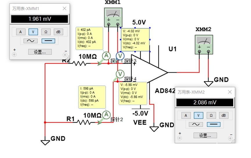 比如這個(gè)仿真圖中,輸入失調(diào)電流是0.4nA和0.6nA,那么當(dāng)輸入源阻抗是10MΩ時(shí),得到的輸入偏置電壓是-4.20mV和-5.96mV,然后同相輸入端和反相輸入端的凈輸入電壓差值就是1.96mV,因?yàn)闆]有加增益電阻,所以這個(gè)儀表放大器是一倍放大,但是輸出是2.086mV是因?yàn)檩敵鲇袀€(gè)最小電壓疊加了,2.086-1.961=0.125mV。