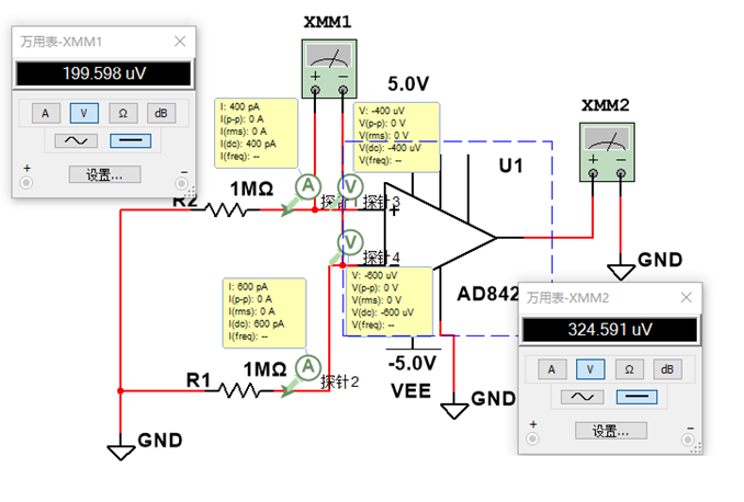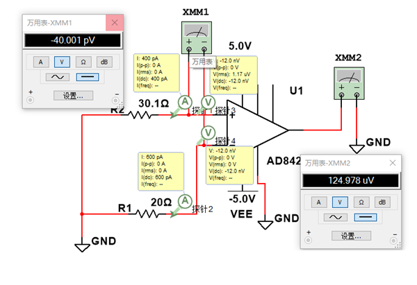 以上的仿真圖都是源阻抗相匹配的情況下,通過更改輸入源阻抗之后發(fā)現(xiàn),輸入電壓降低到了uV級(jí)別,輸出依然會(huì)多一個(gè)125uV的電壓。那么有沒有可能讓輸入的電壓無限接近于0呢?已知輸入偏置電流為0.4nA和0.6nA,那么仿真一下試試。