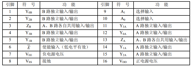 以CD4052為例介紹一下模擬開(kāi)關(guān)的管腳,以及真值表(大多數(shù)模擬開(kāi)關(guān)定義都差不多)。CD4052是一款帶有公共使能輸入控制位的2路四選一模擬開(kāi)關(guān)電路。每一個(gè)多路選擇開(kāi)關(guān)都有四個(gè)獨(dú)立的輸入/輸出(Y0到Y(jié)3)、一個(gè)公共的輸入/輸出端(Z)和選擇輸入端(A),那么接下來(lái)介紹一下大致的管腳定義: