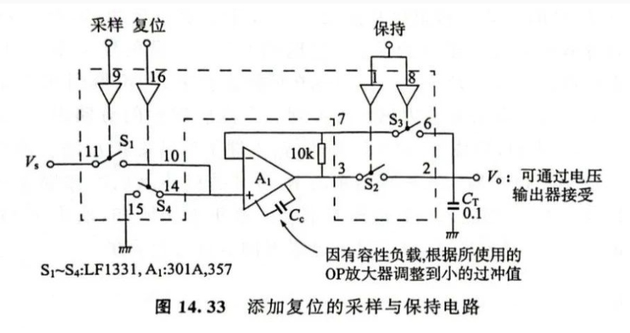 下圖是把采樣與保持以及復(fù)位電路通過(guò)OP放大器與IC模擬開(kāi)關(guān)進(jìn)行總結(jié)的一個(gè)示例。預(yù)先將S2與S3設(shè)為導(dǎo)通,如果S4斷開(kāi),S1為導(dǎo)通,就取樣。若將S2和S3設(shè)為斷開(kāi),CT就保持之前采樣的電壓(此時(shí)要考慮模擬開(kāi)關(guān)的漏電流)。將S2與S3設(shè)為導(dǎo)通,如果S4導(dǎo)通,就復(fù)位(運(yùn)放輸出跟隨同相輸入端輸出0,給電容保持放電,復(fù)位電容)。