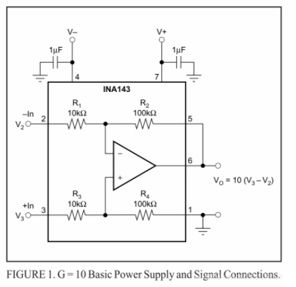 如上圖可以看出,在INA143內(nèi)部已經(jīng)集成了電阻直接構(gòu)成了差分放大。下面來(lái)看一下此差放的幾種接法: