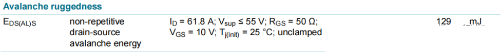 P=0.5 x 55V x 1.3 x 61.8A x 60us=133mJ。此值和極限值表格中的129mJ很接近了。