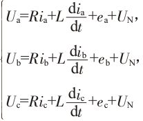 式中:Ua、Ub、Uc 為電機(jī)三相電壓;R、L分別表示每相繞組的電阻和電感;ia、ib、ic為三相定子電流;ea、eb、ec為電機(jī)三相反電勢;UN為電機(jī)中性點對地電壓。