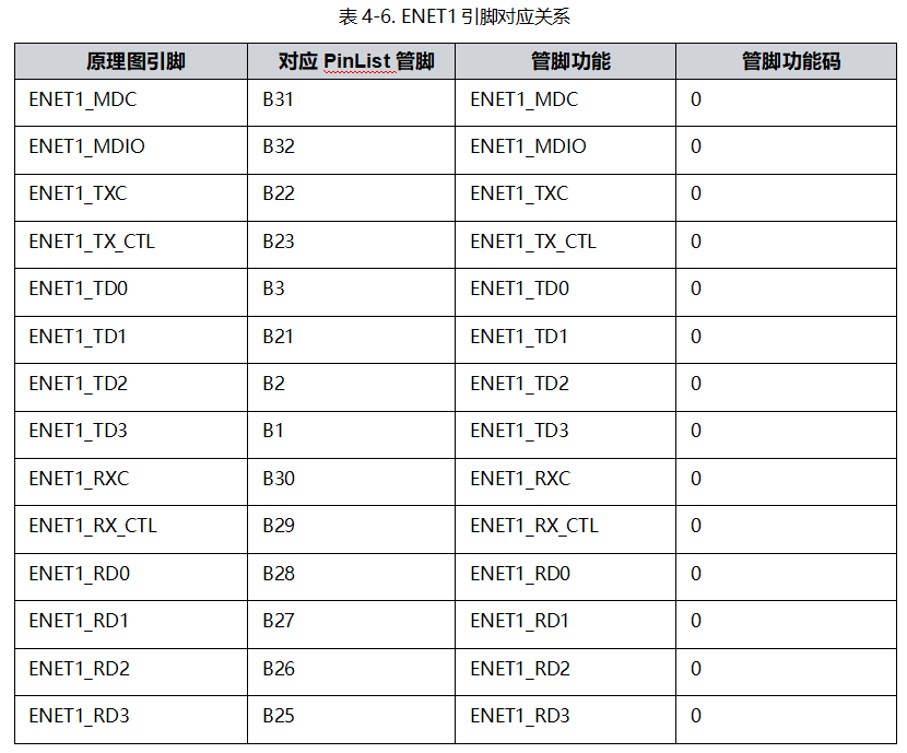 查看原理圖與《MYD-LMX9X-PinList-V1.0.pdf》得出 ENET1數(shù)據(jù)管腳與i.MX93的對應(yīng)關(guān)系如表4-6: