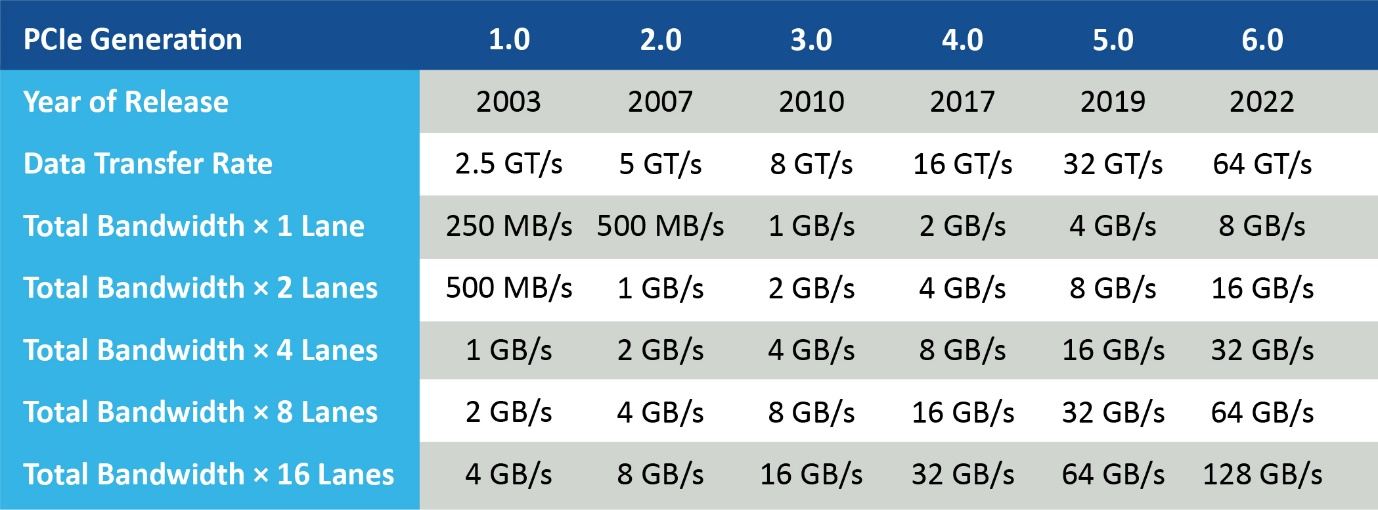 PCIe是一種點對點雙向總線,作為一種混合串行總線,它可以在單通道或2、4、8或16條并行通道中實施,以實現(xiàn)更大的帶寬。此外,每代PCIe的性能也都在不斷提升。圖2展示了PCIe的演變情況。