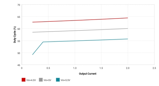 圖2顯示了工作周期、輸入電壓和輸出電流之間的關系.當輸入電壓為4.5V(最小),輸出電流為2a(最大)時,最大負載周期的額定值為64.4%。