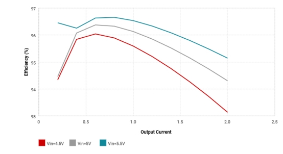 圖3顯示了效率、輸入電壓和輸出電流之間的關系.有趣的是,當輸出電流在750馬左右時,而不是當它是最小時,效率就達到了最高。自然地,由于轉(zhuǎn)換器的輸入電壓和輸出電壓之間的差異很小,效率更高。這就是為什么當輸入電壓為5.5伏時,效率最高的原因。
