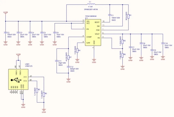 UB1是一個UB4135型連接器,可以連續(xù)處理5a電流。R3和R5是拉下電阻器,將USB型C端口定義為負載端。C5是用于降低輸入噪聲和穩(wěn)定升壓變換器的輸入電容器,特別是在涌流輸入電流中。C6是內(nèi)部調(diào)節(jié)器(VCC銷)輸出的強制電容器(高于1UF)。R7、C11和C12屬于環(huán)路補償網(wǎng)絡,并連接到誤差放大器銷的輸出。R4設定了芯片的當前極限,該極限已設定為大約6.2A(最大值為8a)。