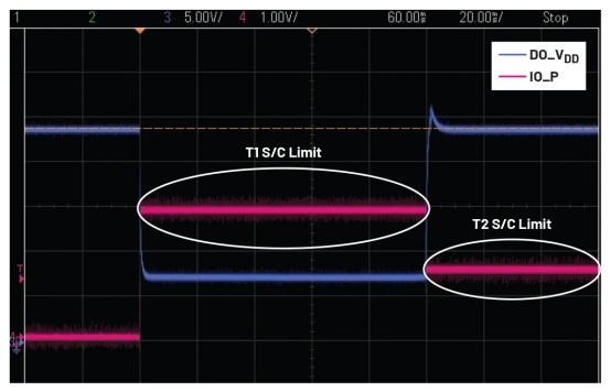 圖5和圖6顯示了DO_V 數(shù)據(jù)交換 測(cè)試人員T1和T2短路限制,證明與Adp1034的來源大電流的穩(wěn)定性。