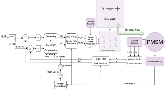 上圖突出顯示了FOC轉(zhuǎn)矩控制器的基本部件。它的主要輸入來自于q-電流,它直接對應于電機產(chǎn)生的轉(zhuǎn)矩。與q電流外,與q電流正交的d電流在PMS電機的FOC中起著至關(guān)重要的作用。q電流與轉(zhuǎn)矩直接相關(guān),而d電流負責控制電機中的磁通量。在正常工作條件下,PMSM的d電流被理想地設(shè)置為零。這是因為電機固有的磁場是從永磁體中獲得的,而任何由非零d電流引起的額外通量都會降低效率,而且通常是不必要的。保持d電流在零可以優(yōu)化每安培的扭矩,確保電機有效運行,不會產(chǎn)生過多的熱量。然而,在像磁場減弱這樣的情況下,d電流從這個零值調(diào)整,以允許操作超過電機的基本速度。正確管理d流,保持在零,必要時調(diào)整,確保最佳電機效率,防止退磁雖然某些功能塊需要硬件實現(xiàn),但控制器的核心邏輯主要是在單片機、DSP或FPGA中作為軟件執(zhí)行的。該位置傳感器便于在全速度下,特別是在較低速度下,電動機的FOC操作。