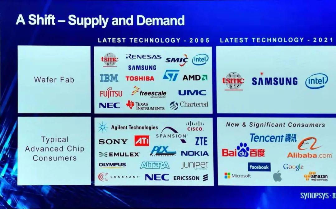 一方面,由于最先進(jìn)工藝晶圓制造生產(chǎn)線的建設(shè)成本不斷抬升——一條最先進(jìn)邏輯工藝生產(chǎn)線,投入資金從幾億美元上升到如今超百億美元——使得眾多廠商退出了先進(jìn)工藝制造競(jìng)賽,在2005年時(shí),擁有先進(jìn)工藝(130至90納米)晶圓制造產(chǎn)線的廠商有十多家,到2021年,還能持續(xù)進(jìn)行先進(jìn)工藝產(chǎn)線投入的廠商只剩下臺(tái)積電、三星和英特爾三家。