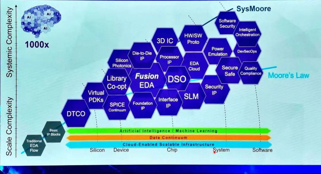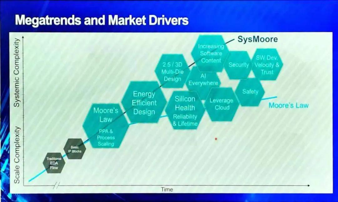 在2021新思科技全球用戶大會(huì)(SNUG World 2021)上,新思科技聯(lián)席CEO、創(chuàng)始人Aart de Geus提出“系統(tǒng)摩爾定律(SysMoore)”概念。系統(tǒng)摩爾定律將提升集成度和復(fù)雜度的理念拓展到電子系統(tǒng)的每個(gè)環(huán)節(jié),從硅晶圓、晶體管、芯片、系統(tǒng)硬件到軟件和服務(wù),每一個(gè)環(huán)節(jié)都可以為構(gòu)建更復(fù)雜、性能更高、能耗更低而成本更優(yōu)的產(chǎn)品做出貢獻(xiàn),開(kāi)發(fā)者不再只依賴工藝和架構(gòu)等少數(shù)幾個(gè)維度去實(shí)現(xiàn)性能和復(fù)雜度的指數(shù)型提升,將指標(biāo)分散到不同環(huán)節(jié)去承擔(dān)之后,電子系統(tǒng)性能和功能復(fù)雜度增長(zhǎng)曲線重回指數(shù)型增長(zhǎng)軌跡,新思科技為業(yè)界帶來(lái)千倍開(kāi)發(fā)效率和性能提升的承諾。