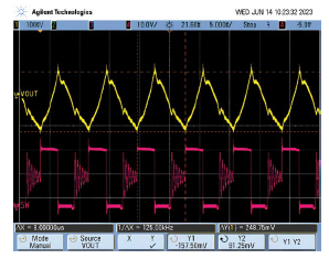 圖5.飽和電感輸出紋波。尖峰會(huì)延續(xù)到輸出,其中包含噪聲和電壓尖峰。