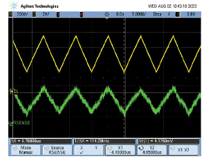 圖11.超小電感電流波形。電流和RSENSE中出現(xiàn)振鈴表明電源處于DCM模式。