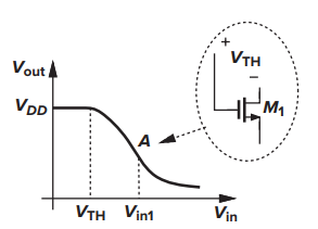 當M1處于線性區(qū)和飽和區(qū)邊界時,Vout=Vin-VTH,也就是對應(yīng)圖中的A點。