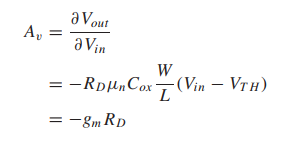 當Vin接近VTH時,M1管開始導(dǎo)通,存在漏極電流ID,使得Vout減小。因此,我們可以得到:
