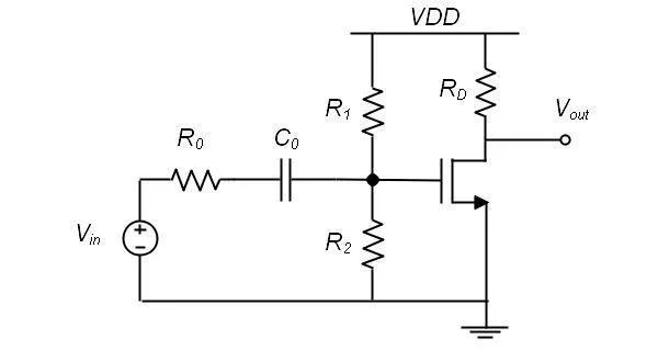 Fig. 1中的供電設(shè)計是復(fù)雜的,需要兩種電源才能使放大器工作,這個是我們不希望的,所以Fig. 2中利用電阻的分壓電路,使VDD分一部分電壓給柵極提供偏置電壓,大小為VDD*R2/(R1+R2)。這樣整個系統(tǒng)就可以只用一個供電單元來提供電壓,簡化了設(shè)計。所以R1,R2的作用是分壓,為MOSFET提供柵極開啟電壓。