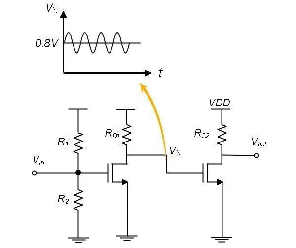 Fig. 2 中的C0為一個隔直電容,作用是防止前級直流信號對后級偏置電壓的影響。只有交流信號能夠通過后級電路進行放大。但是電容對于MOSFET器件來說是一個非常大的器件,增加一個電容會占用芯片很大一塊位置,所以盡量避免使用電容,如圖Fig. 3有兩級放大電路,如果前一級的輸出Vx的直流部分正好可以作為后級的直流偏置,則不需要加電容和分壓電阻。
