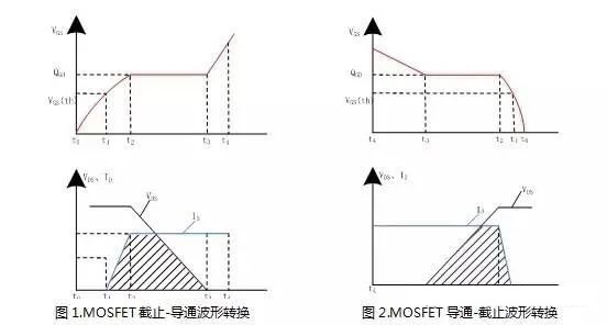 MOSFET導通與關(guān)斷過程中都會產(chǎn)生損耗,在這兩個轉(zhuǎn)換過程中,漏極電壓與漏極電流、柵源電壓與電荷之間的關(guān)系如圖1和圖2所示,現(xiàn)以導通轉(zhuǎn)換過程為例進行分析: