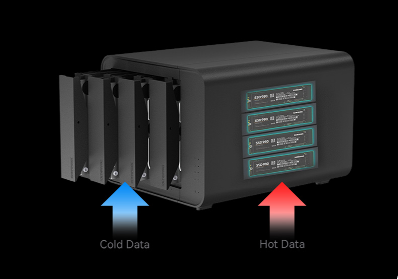 在數(shù)據(jù)的世界里,冷數(shù)據(jù)與熱數(shù)據(jù)是兩大核心分類(lèi)。冷數(shù)據(jù)如歷史檔案、長(zhǎng)期備份等,訪問(wèn)頻率低但長(zhǎng)期保存要求高;而熱數(shù)據(jù)如實(shí)時(shí)工作文檔、高頻訪問(wèn)的視頻素材等,則對(duì)讀寫(xiě)速度和訪問(wèn)效率有著極高的要求。鐵威馬D8 Hybrid硬盤(pán)陣列柜正是基于這一理念,創(chuàng)新性地融合了SATA與M.2 NVMe兩種存儲(chǔ)技術(shù),成為業(yè)界首款實(shí)現(xiàn)冷熱數(shù)據(jù)一體化管理的產(chǎn)品。
