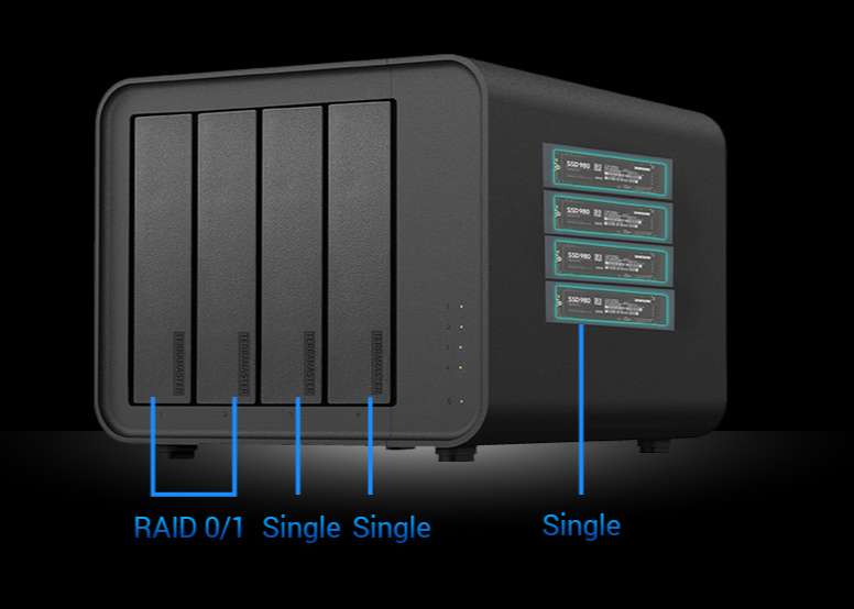 D8 Hybrid的獨(dú)特之處在于其4+4盤(pán)位設(shè)計(jì),即四個(gè)支持3.5/2.5英寸硬盤(pán)的SATA盤(pán)位和四個(gè)M.2 NVMe盤(pán)位。四個(gè)SATA盤(pán)位能夠容納最大至24TB的機(jī)械硬盤(pán),為冷數(shù)據(jù)提供了充足的存儲(chǔ)空間;而四個(gè)M.2 NVMe盤(pán)位,單盤(pán)容量可達(dá)8TB,則專(zhuān)為熱數(shù)據(jù)的高速讀寫(xiě)需求而生。這樣的組合使得D8 Hybrid的總存儲(chǔ)容量高達(dá)128TB,輕松應(yīng)對(duì)從個(gè)人用戶(hù)到企業(yè)級(jí)用戶(hù)的多元化存儲(chǔ)需求,徹底解決了存儲(chǔ)焦慮。