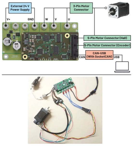 圖 3:TMCM-1636 硬件連接圖(頂部);實際設(shè)置參考圖(底部)
