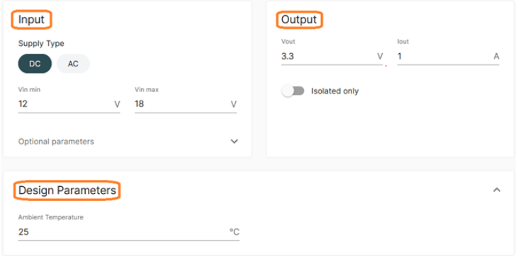 WebDesigner+? 是一款輔助設計電源的在線工具,可以根據輸入輸出要求,推薦電源管理器件和相關電氣器件。所需參數包括:最小和最大輸入電壓、環(huán)境溫度、輸出電壓及電源的輸出電流。該工具支持的輸入參數工作范圍如下: