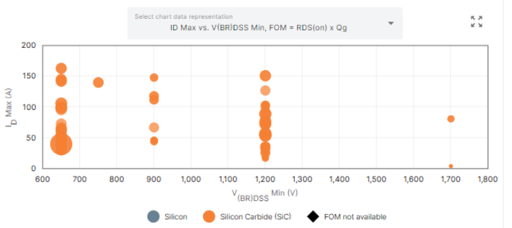 為簡化器件搜索,PRT+ 工具整合了各種先進功能。交互式圖表便是其中之一,能夠以圖形方式直觀呈現產品組合的各種參數。下方例子為 EliteSiC 產品組合的 Rds(on) 品質因數 (FoM)。
