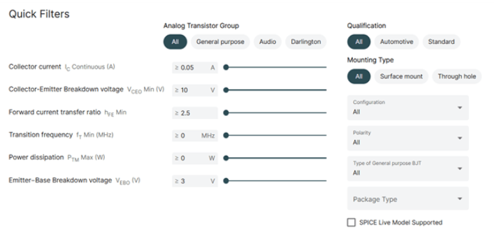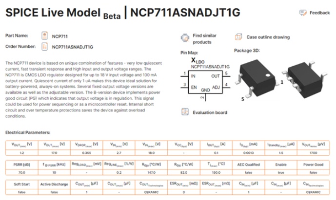 SPICE Live Model 工具的最新 Beta 版目前支持我們LDO、MOSFET和BJT系列中的特定產品。用戶只需單擊“SPICE”圖標即可訪問和操作各種 DC、瞬態(tài)和蒙特卡羅仿真,并在基于 Web 的 SPICE 環(huán)境中評估器件性能。SPICE Live Model 旨在幫助工程師更深入地了解安森美器件和應用設計。該工具基于 SPICE 仿真,可提供有關產品行為的詳細信息,用戶可自行調整各種仿真參數和工作條件參數。除此之外,其中還提供獲取重要產品資料(包括產品手冊和評估板)的快捷方式。