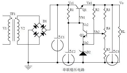串聯(lián)穩(wěn)壓電源,即利用串聯(lián)于電路中的調(diào)整管Q1進行動態(tài)分壓而使負(fù)載得到穩(wěn)定電壓的電路。串聯(lián)型穩(wěn)壓電源的工作原理,是在輸入電壓存在波動時,輸出電壓保持恒定的裝置,利用穩(wěn)壓二極管兩端電壓不變的原理,使輸出電壓保持不變,并用多級三極管組成達林頓復(fù)合電路,組成放大器提高穩(wěn)壓精度。
