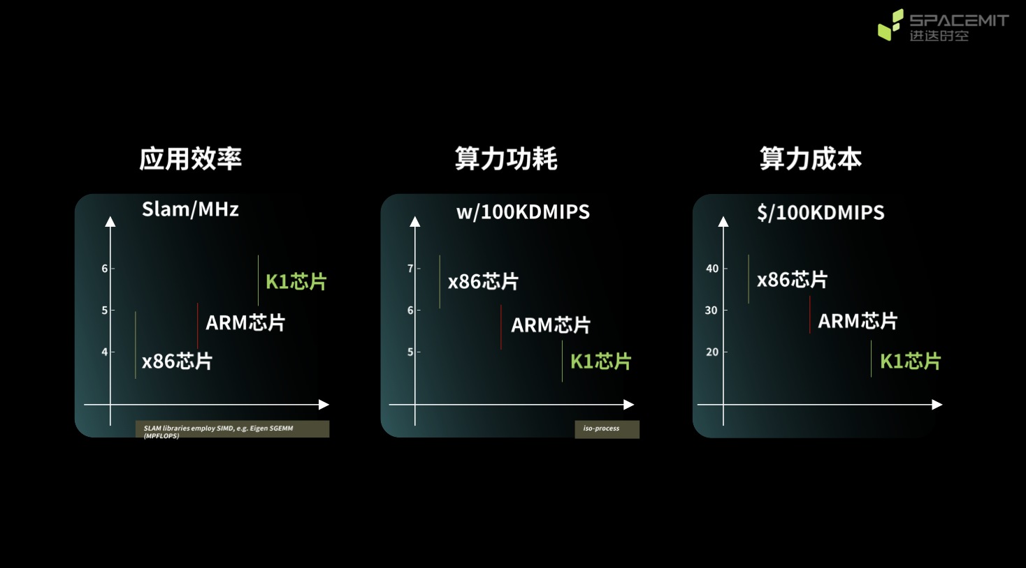 下圖展示了K1芯片與ARM芯片和x86芯片在應用效率、算力功耗和算力成本三個維度上的對比。K1芯片在這三個維度上都表現(xiàn)出明顯的優(yōu)勢。在應用效率方面,K1芯片的效率最高,超過了6 Slam/MHz,相比之下,ARM芯片的效率略低,在5到6之間,而x86芯片的效率則在4到5之間。在算力功耗方面,K1芯片的功耗最低,典型功耗為3.5W,最低可降至2.8W/100KDMIPS,而ARM芯片的功耗稍高,介于5到6之間,x86芯片的功耗最高,超過了7 W/100KDMIPS。在算力成本上,K1芯片的成本最低,約為20到30/100KDMIPS。總體來看,K1芯片在應用效率、功耗和成本上都優(yōu)于ARM芯片和x86芯片。