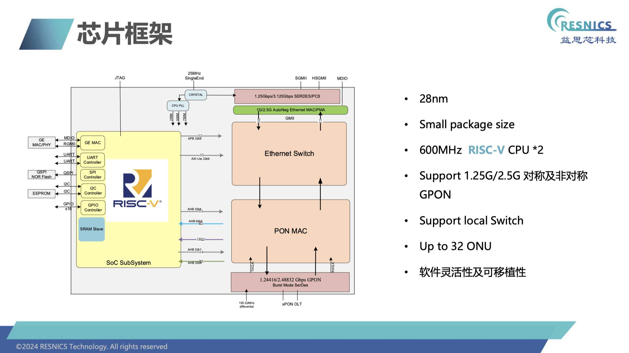 此外,益思芯科技還決定將芯片的控制部分從之前運(yùn)行在兩個(gè)ARM A9核心上的架構(gòu),轉(zhuǎn)移到RISC-V上。與此同時(shí)還開發(fā)了DPU(數(shù)據(jù)處理單元),專門處理網(wǎng)絡(luò)包,并設(shè)計(jì)了自己的以太網(wǎng)交換機(jī),能夠高效處理網(wǎng)絡(luò)流量。此外,該芯片還集成了PON MAC模塊,將光網(wǎng)絡(luò)中的協(xié)議數(shù)據(jù)流轉(zhuǎn)換為以太網(wǎng)流量,以支持Wi-Fi等功能。