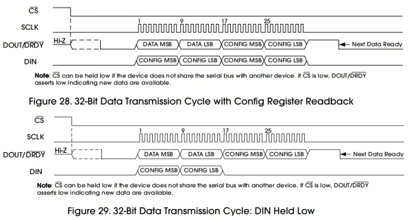 在32位的數(shù)據(jù)傳輸周期中,數(shù)據(jù)由四字節(jié)組成:前兩個字節(jié)包含轉(zhuǎn)換結(jié)果,后兩個字節(jié)為配置寄存器的回讀數(shù)據(jù)。系統(tǒng)始終優(yōu)先讀取最高有效字節(jié)(MSB)。