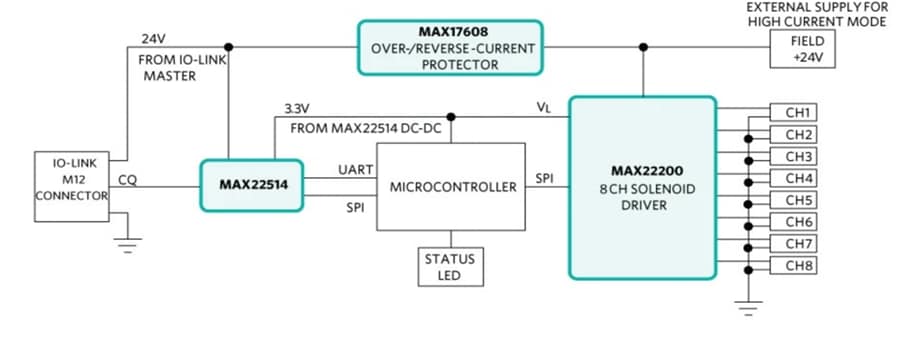 該參考設計可以通過兩種方式供電。例如直接通過IO-Link主站供電(支持高達800mA的總負載),或使用外部電源提供更高的電流。參考設計使用MAX17608限流器,具有過壓(OV)、欠壓(UV)和反向保護功能,確保IO-Link部分始終通電,從而避免電流回流至IO-Link主站。使用IO-Link進行數(shù)據(jù)通信的優(yōu)勢在于,它支持四種不同類型的傳輸——過程數(shù)據(jù)、診斷、配置和事件,這些信息可以指示執(zhí)行器是否故障,以便快速執(zhí)行相關操作。IO-Link的另一個優(yōu)勢在于可使執(zhí)行器“與網(wǎng)絡無關”,也就是執(zhí)行器可以在任何工業(yè)網(wǎng)絡上工作,工程師無需擔心執(zhí)行器設計選擇哪種協(xié)議。