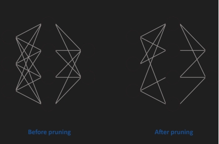 圖2——剪枝減少了神經(jīng)網(wǎng)絡(luò)的密度。上圖中,某些神經(jīng)元之間的連接權(quán)重被設(shè)為零。但有時(shí)神經(jīng)元也可以被剪掉(圖中未顯示)。
