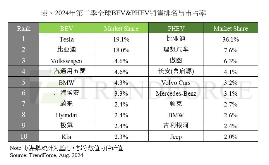 Aug. 22 ---- 根據(jù)TrendForce集邦咨詢最新汽車研究,2024年第二季全球新能源車(含純電動(dòng)車、插電混合式電動(dòng)車、氫燃料電池車)銷量達(dá)到376.9萬輛,較第一季增長近30%、年增24.2%。盡管特斯拉依舊占據(jù)純電車市占率第一,但其銷量較去年有所下降。比亞迪在純電車市場(chǎng)銷量表現(xiàn)穩(wěn)健,插電混合式電動(dòng)車第二季的市占率也突破36%。