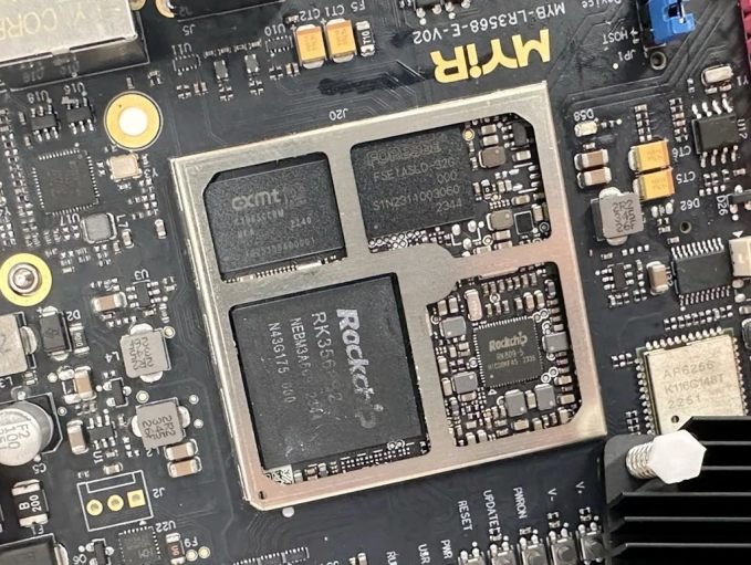 以上大致就是這款開發(fā)板的外設接口,同時有一點比較值得稱道,米爾電子宣稱核心板采用的是100%國產(chǎn)物料,所以接下去我們來看看板子上一些主要的芯片都是哪些廠商供貨的。這里的話我已經(jīng)把板子的散熱器和核心板的屏蔽罩取下,中間這顆SoC就是瑞芯微的RK3568J,可以說是這款開發(fā)板的最大亮點之一。