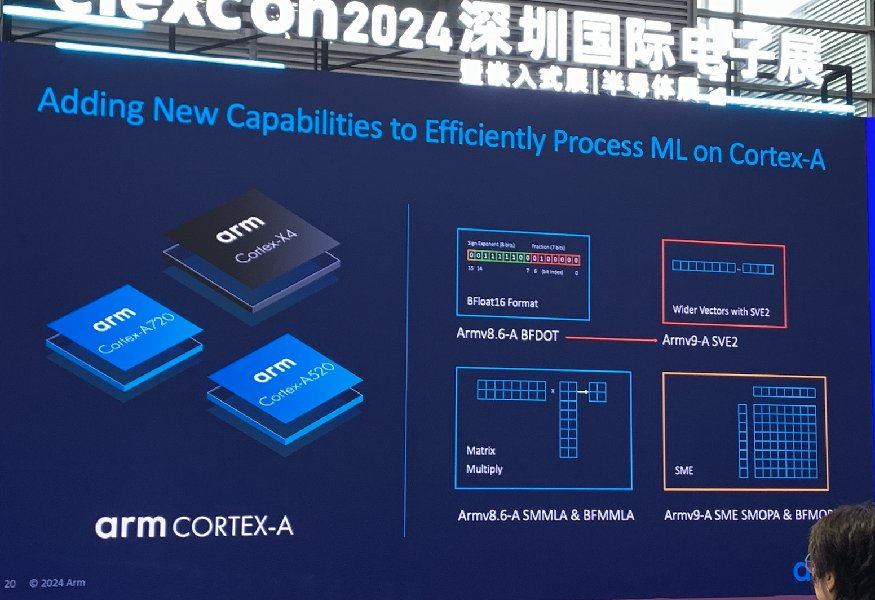 在IoT、智能網(wǎng)關(guān)、人機(jī)交互、視覺、邊緣服務(wù)器等領(lǐng)域,Arm的Cortex-A系列處理器產(chǎn)品中引入了SVE2的拓展,能夠更高效便利地處理邊緣AI的工作負(fù)載。Arm去年發(fā)布的Cortex-X4、Cortex-A720及Cortex-A520均是基于最新的Armv9.2架構(gòu),支持可拓展矢量引擎。未來還將更多加入可拓展矩陣引擎支持,助力實現(xiàn)AI操作中吞吐量的顯著提升。