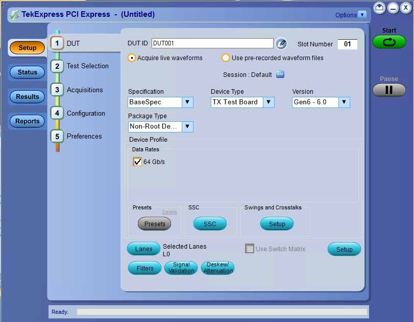Tektronix的PCE3、PCE4和PCE5選項中的TekExpress自動化軟件可以通過選擇特定型號的Tektronix AFG或AWG、GRL PCIE 3/4控制器或NI USB6501 CBB控制器來控制DUT,自動循環(huán)通過符合性測試所需的各種速度、去加重和預(yù)設(shè)值。這消除了在CBB和CLB測試夾具上使用手動按鈕控制DUT時容易出錯的問題。