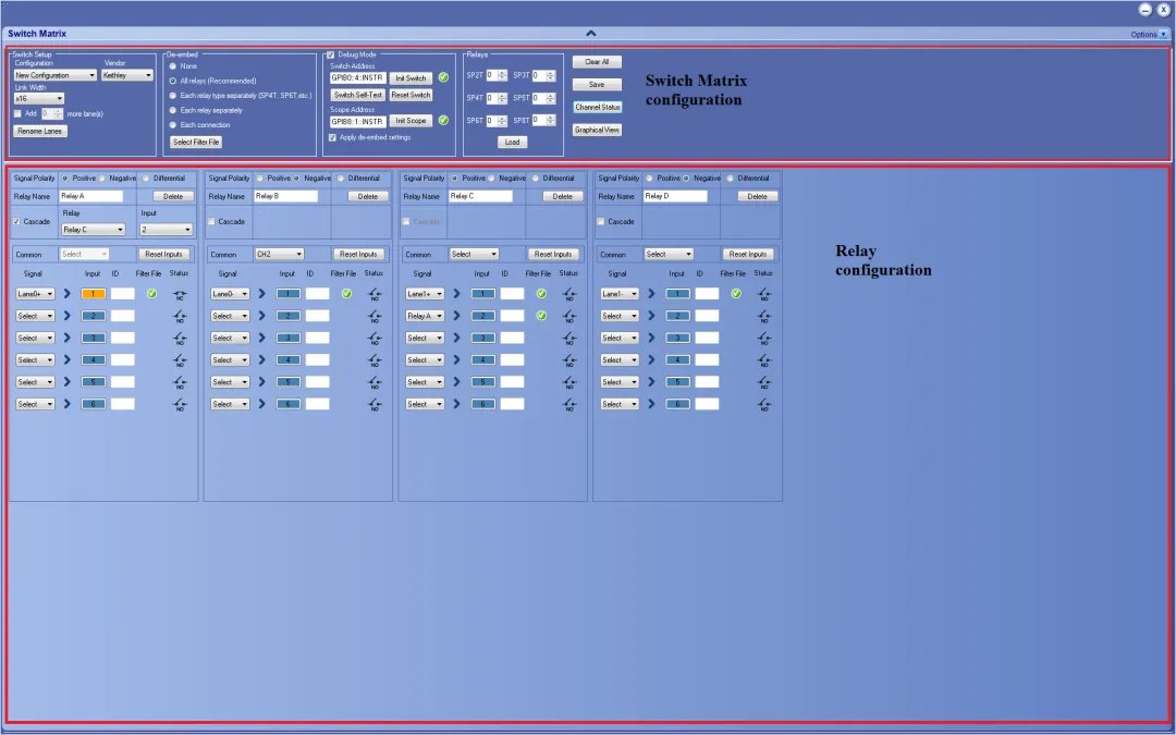 開關(guān)矩陣應(yīng)用程序允許使用射頻開關(guān)配置和設(shè)置自動化的多通道測試。該解決方案允許您將多個發(fā)射機信號映射到指定的輸入,并將選定的輸入轉(zhuǎn)發(fā)到另一個繼電器或示波器通道。選項SWX-PCE支持使用Keithley和Gigatronics開關(guān)分別進行最多x12和x16通道的測試,增強了吞吐量和自動化測試速度。