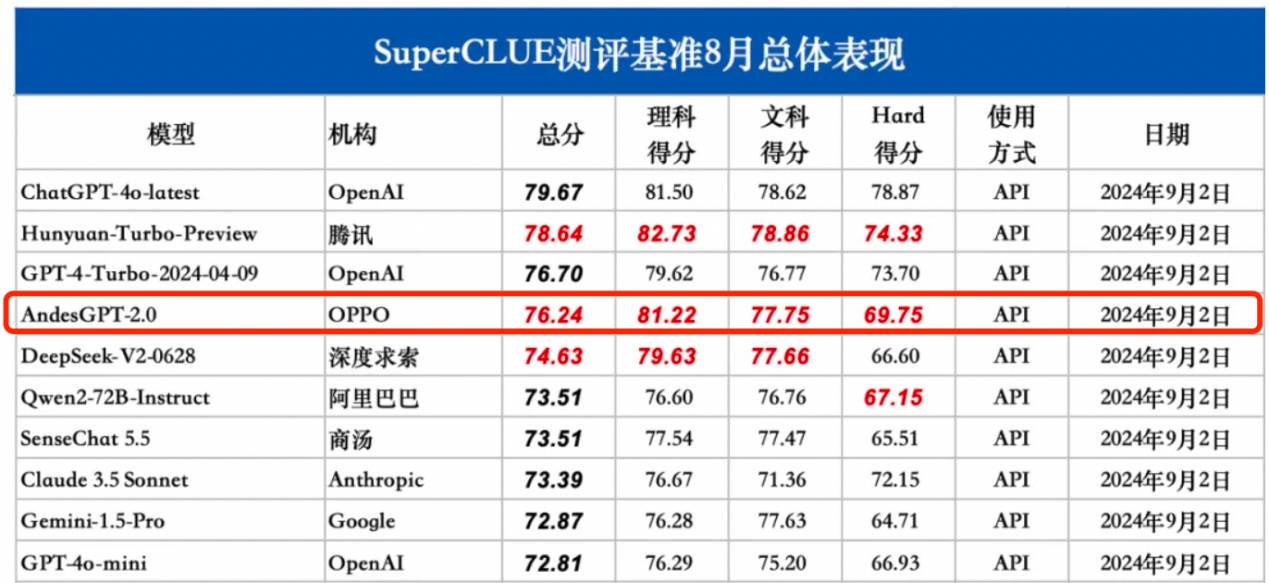 日前,權(quán)威第三方AGI評(píng)測(cè)機(jī)構(gòu)SuperCLUE對(duì)外發(fā)布了《中文大模型基準(zhǔn)評(píng)測(cè)2024年8月報(bào)告》,報(bào)告展示了該機(jī)構(gòu)對(duì)2024年度中文大模型的階段性進(jìn)展評(píng)估,分析了國(guó)內(nèi)外大模型在不同任務(wù)上的差異化表現(xiàn)。其中,由OPPO自主訓(xùn)練的安第斯大模型AndesGPT-2.0在8月測(cè)評(píng)中表現(xiàn)優(yōu)異,斬獲SuperCLUE 8月總榜第4,國(guó)內(nèi)大模型第2。