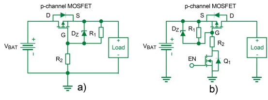 圖 4:使用 p 溝道功率 MOSFET 實現(xiàn) a) 反極性保護和 b) 負載開關(guān)